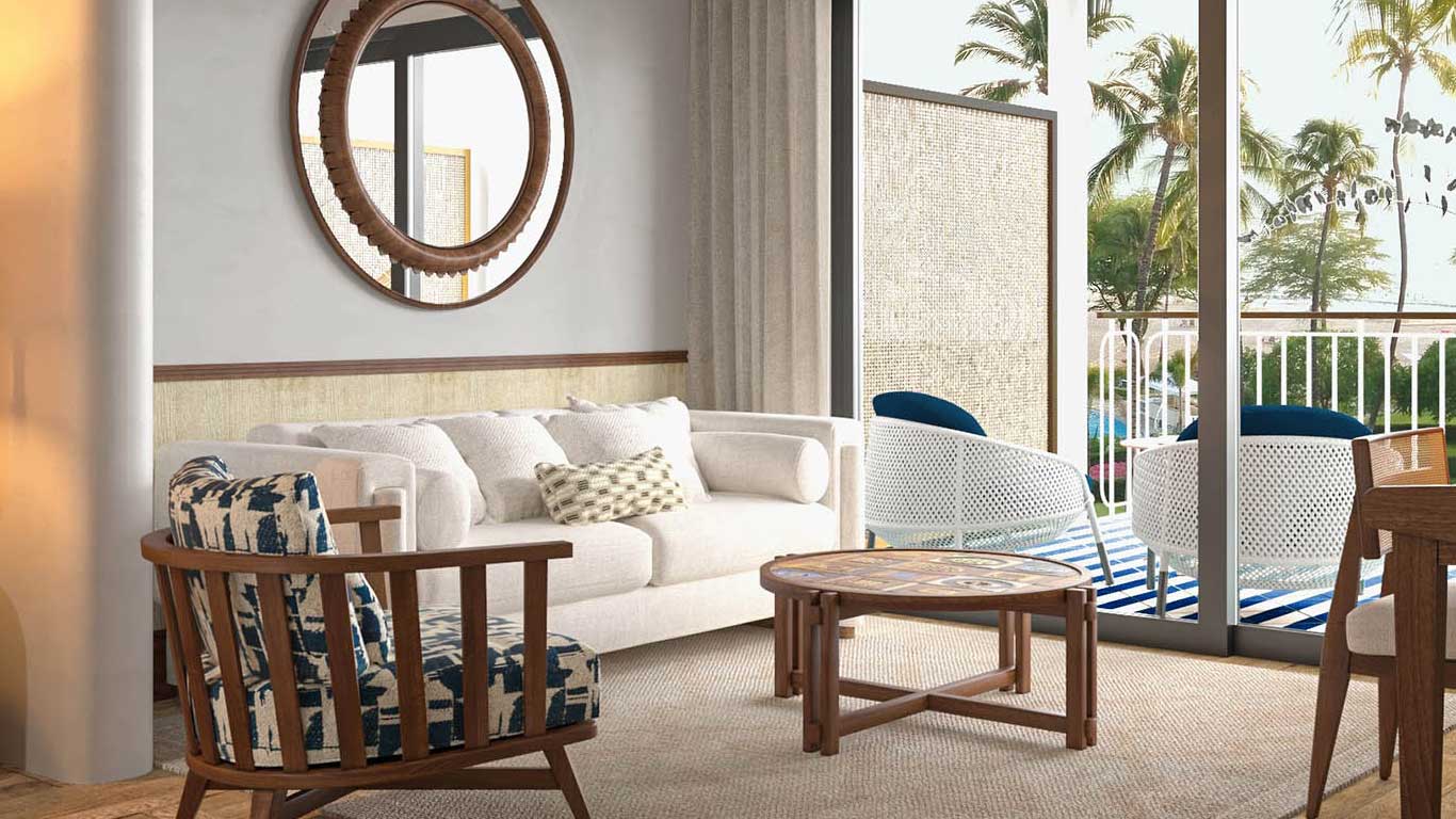 The Junior Suite Ocean View at Ocean Allure Costa Mujeres offers a large lounge area with a sofa bed and a terrace with sea views. It also features two double beds or one king-size bed.